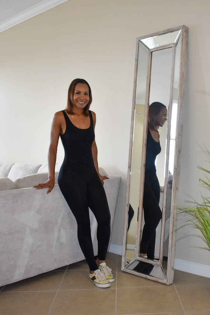 This romper has a low back but yet sleek with a solid black color. It's super comfortable and provides full leg coverage, perfect for your everyday needs.