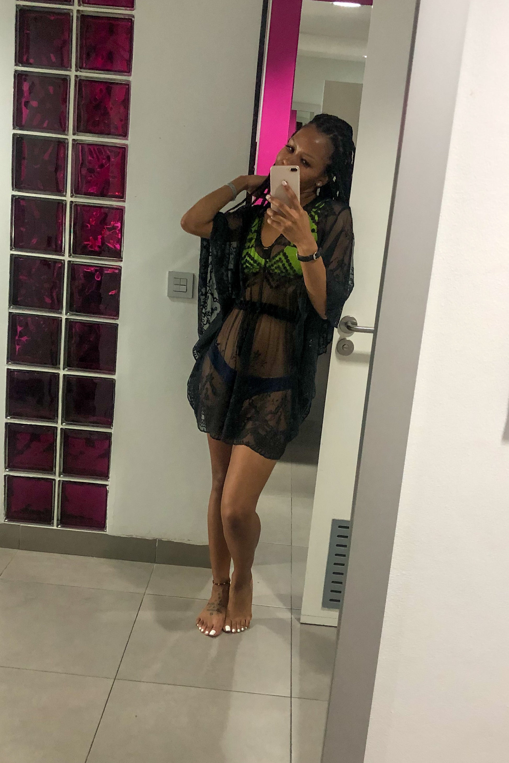 This cover up has a drawstring waist, with an elegant design. With the elegant design this cover up will enhance your bathing suit/bikini.